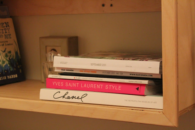 I have made a vow to not turn this shelf into a junk pile. All the pretty little crystal containers I've picked up at thrift stores hold my jewelry and air plants. Only the books and magazines I'm currently reading are allowed on the bottom half. Our room looks more spacious and clean and another DIY is complete!